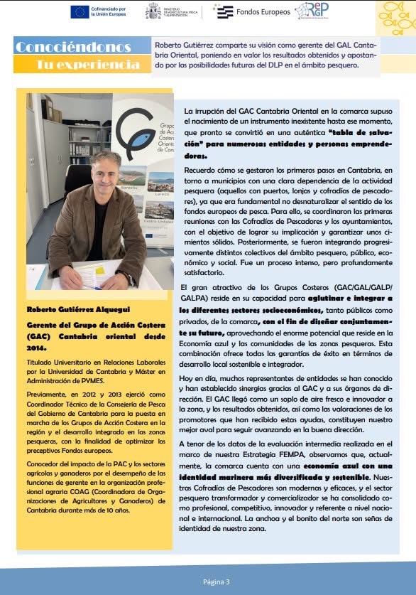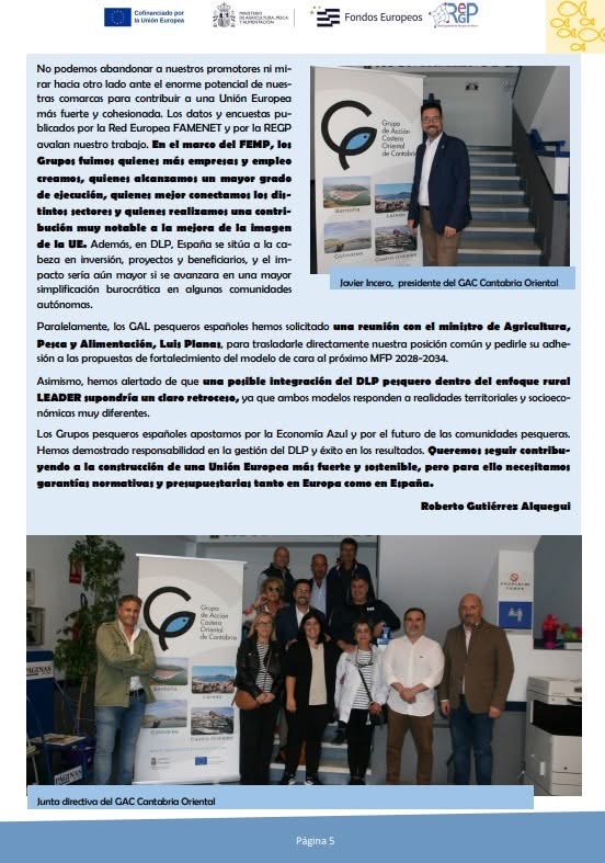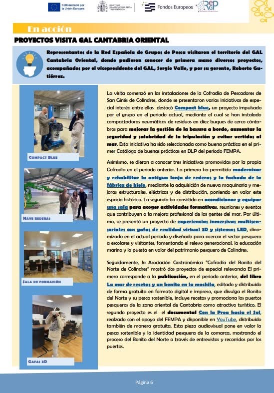 El último Boletín de la Red Española de Grupos de Pesca (REGP) del Ministerio de Agricultura, Pesca y Alimentación ha dedicado un reportaje especial al Grupo de Acción Costera Oriental de Cantabria, con un artículo de su gerente, Roberto Gutiérrez Alquegui, en el que comparte su visión sobre el grupo, poniendo en valor los resultados obtenidos y apostando por las posibilidades futuras del DLP en el ámbito pesquero, y un resumen de la visita que responsables de la REGP giraron a la zona del GAC el pasado mes de noviembre y a diferentes proyectos destacados.